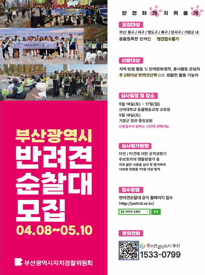 부산광역시자치경찰위원회는 ‘2026년 부산 반려견 순찰대’를 부산 전 자치구로 확대 운영하고, 미운영 지역을 대상으로 신규 대원을 모집한다고 밝혔다.