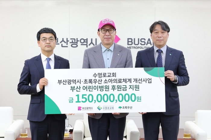 부산시는 8일 시청 의전실에서 수영로교회와 초록우산이 함께하는 ‘부산 어린이병원 후원금 전달식’을 개최했다고 밝혔다. 이날 전달된 후원금 1억5천만 원은 수영로교회 성도들이 특별새벽기도 기간 동안 자발적으로 모은 헌금으로, 전액 부산 어린이병원 건립을 위한 '착한헌금'으로 기탁했다.
