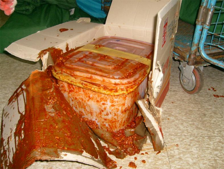 # 발효 가스로 부피 늘어나 약한 비닐봉지.상자 찢어져 국물 뚝뚝