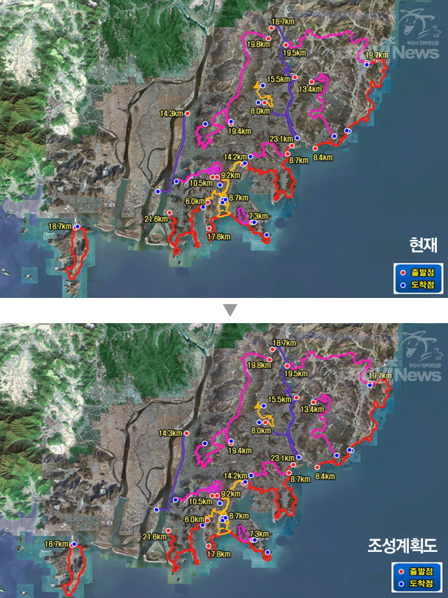 부산 갈맷길이 단절된 구간을 모두 연결, ‘9개 코스 21개 구간’으로 정리된다. 임랑해변도로부터 가덕도 해변까지를 잇는 ‘부산 종주길’이 생기는 것이다.