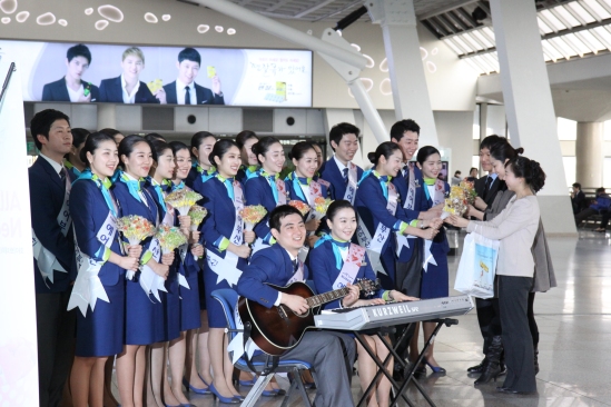 이 날 행사에서는 올 초 입사한 에어부산 신입 캐빈승무원 20여 명이 공항을 찾은 이들을 위해 피아노와 기타, 우쿠렐레를 연주하며 사랑을 소재로 한 노래들을 합창하고 사탕도 선물했다.