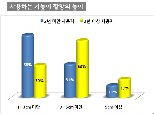 주로 사용하는 키높이 깔창의 높이에 대한 질문에는 2년 미만의 사용자들은 편안하게 신을 수 있는 1-3cm의 깔창을 즐겨 신는다고 응답한 반면, 장기 사용자 일수록 키높이 깔창의 사용에 익숙해지면서 더 커 보일 수 있도록 조금이라도 높은 깔창을 선호하는 것으로 나타났다.