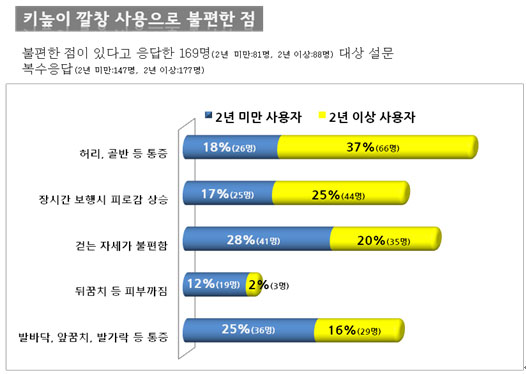 사용기간 별로 살펴보면 2년 미만 사용자들 중 28%(41명)가 걷는 자세 불편, 25%(36명)가 발바닥, 발꿈치, 발가락 등 발의 통증을 주로 호소한 반면, 2년 이상 사용자들은 37%(66명)가 허리, 골반 통증, 25%(44명)가 장시간 보행시의 피로감으로 불편하다고 응답했다.