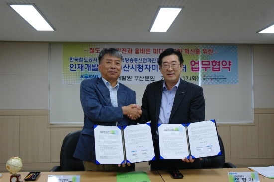 코레일 인재개발원(원장 민형기)은 부산지역 철도 종사자 미디어 교육 활성화를 위해 17일 인재개발원 부산분원에서 코레일 인재개발원장과 부산시청자미디어센터장 등 관계자가 참석한 가운데 한국방송통신전파진흥원 부산시청자미디어센터와 MOU(상호양해각서)를 체결했다.