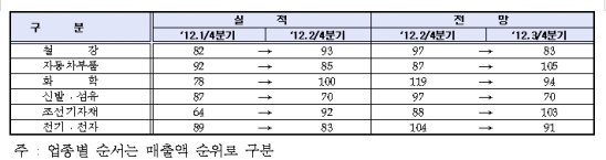 또한 신발·섬유는 주요 수출국의 소비심리 위축으로 인한 수출 감소세와 내수시장에서 낮은 단가의 계절상품 판매 비중 증가 및 정장제품에 대한 수요 부진이 겹치며 자금사정이 가장 악화될 것으로 나타났다.