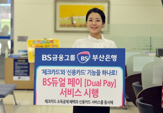 BS 듀얼 페이 서비스는 고객이 먼저 지정한 건당, 일별, 월별 한도 범위 내에서는 통장잔액이 있을 경우 체크카드로 결제되고, 계좌 잔액이 부족하거나 지정 한도를 초과한 금액에 대해서는 신용카드로 결제가 자동적용되는 신개념 복합 결제 서비스다. 합리적인 소비나 연말정산효과를 노리는 직장인이나 주부들에게는 효과적인 서비스가 될 것으로 예상하고 있다.