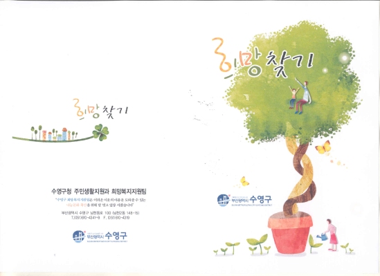 수영구가 지역주민의 다양한 욕구에 맞는 맞춤형 서비스 연계, 제공사례를 모은 '희망찾기'라는 사례집을 발간하여 눈길을 끌고 있다.