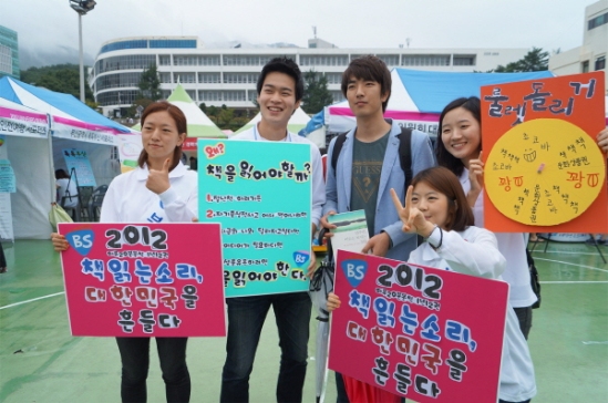 부산은행 대학생홍보대사 20여명은 독서의 계절을 맞아 지난 16일 ‘함께 책을 읽읍시다 ’캠페인을 가졌다. 부산대학교 주변, 장전동 일대 시민들과 함께, 독서와 관련된 퀴즈를 함께 풀어보고, 직접 제작한 책갈피, 문화상품권을 나누는 등 즐거운 시간을 함께했다. 이곳 뿐만이 아니라, 진주 경상대학교에서도 대학생들의 한해 독서 실태를 전하고, 독서를 권장하는 캠페인이 동시에 진행되었다.