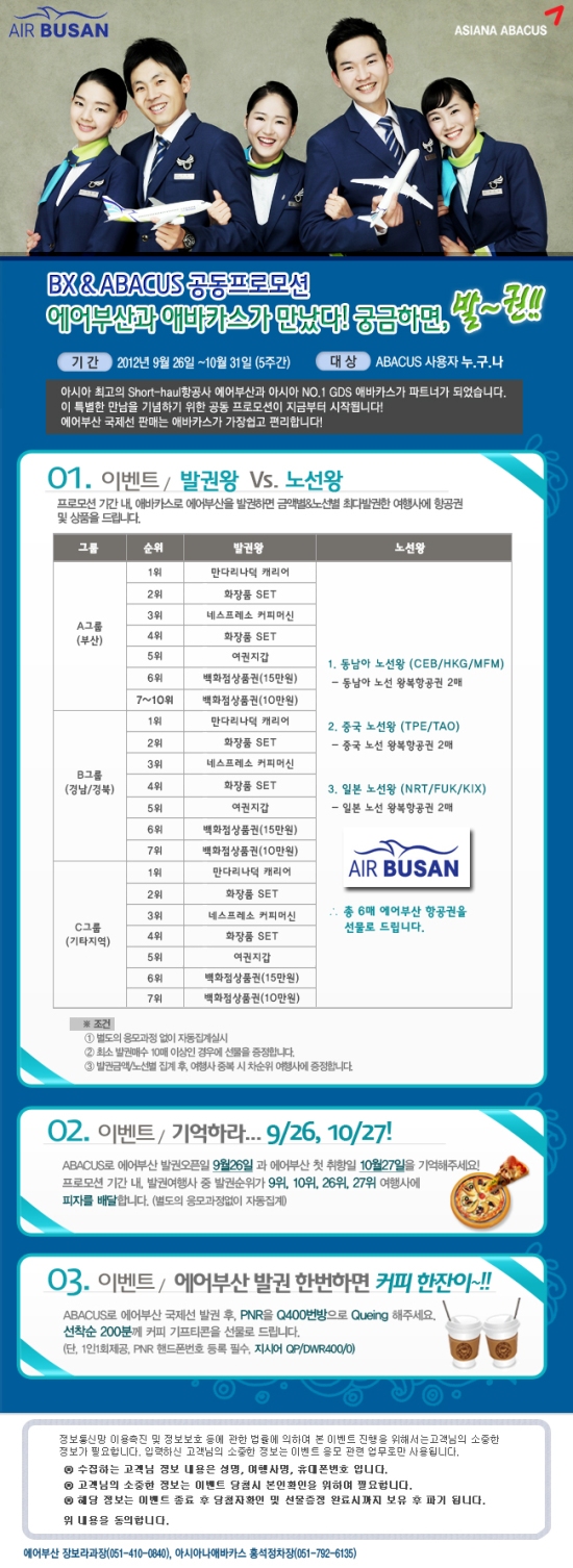 에어부산은 아시아나애바카스㈜와 파트너십을 맺고 26일(수)부터 GDS(Global Distribution System)를 도입, 판매채널을 확대키로 했다.