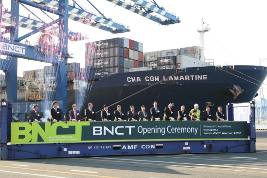 지난 1월 운영을 시작한 BNCT는 안벽길이 1,400m로, 5만톤급 컨테이너선 4척이 동시에 접안할 수 있으며 수직 자동화 설계와 첨단 장비 운용 시스템을 갖춰, 높은 생산성을 자랑하고 있다.