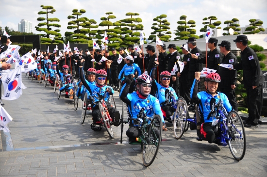부산지방보훈청(청장 이성국)은 16일 오전 10시 UN기념공원에서 부산광역시정무부시장, 남구청장, 지역군부대장, 부산지방국토관리청장, 부산지역 보훈단체장, 학생과 시민 등 500여 명이 참석한 가운데 국가유공자 1급 중상이용사회의 ‘나라사랑 국토종단 희망의 핸드사이클행사’ 출정식을 개최했다.
