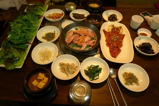 여기에 생선조림과 민들레나물, 오갈피나물, 잡채, 전 등 12가지 반찬이 곁들어져 나온다.