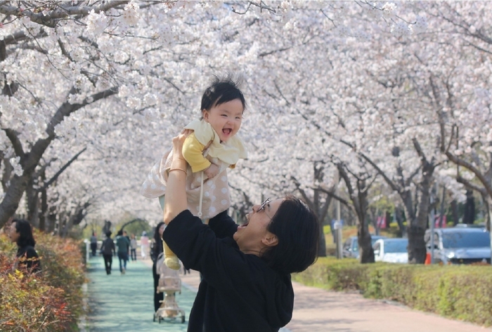 부산시설공단 스포원파크에 방문한 시민이 만개한 벚꽃 아래에서 아이를 안아 올리며 봄의 절정을 만끽하고 있다. (장소: 스포원파크 북측주차장 일원)