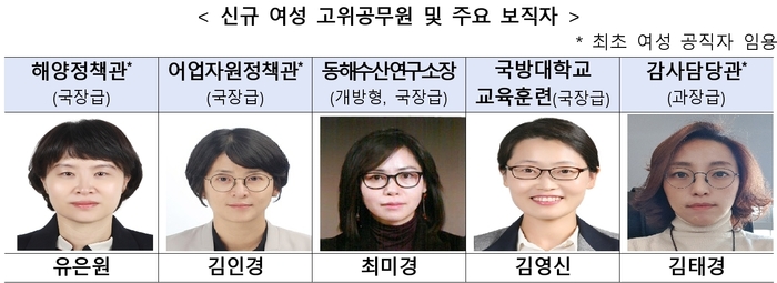 이번 인사에서 국장급 승진자 7명 가운데 4명이 여성으로 발탁됐다. 유은원 해양정책관, 김인경 어업자원정책관, 최미경 동해수산연구소장(개방형 직위), 김영신 국방대학교 교육훈련 파견 등이다. 이에 따라 여성 고위직은 기존 해운물류국장 1명에서 5명으로 대폭 늘어났다.